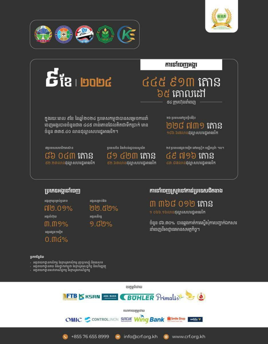 របាយការណ៍សហព័ន្ធស្រូវអង្ករកម្ពុជាបានគូសបញ្ជាក់ថាកម្ពុជានៅក្នុងរយៈពេល9ខែឆ្នាំ2024នេះបាននាំចេញអង្ករមានបរិមាណជាង44ម៉ឺនតោនតាមរយៈនៃការនាំចេញអង្ករចំនួន54ក្រុមហ៊ុនទៅកា