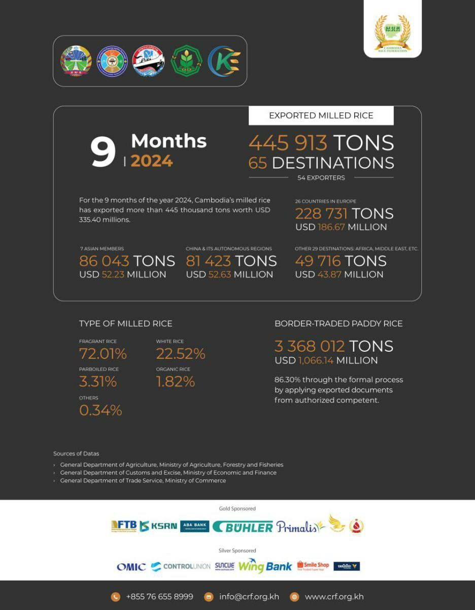 គួរបញ្ជាក់ថាបើតាមរបាយការណ៍អគ្គនាយកដ្ឋានកសិកម្មនៅក្នុងរយៈពេល9ខែឆ្នាំ2023កន្លងមកនេះកម្ពុជាបាននាំចេញអង្ករមានបរិមាណសរុបជាង45ម៉ឺនតោនទៅកាន់ប្រទេសគោលដៅចំនួន